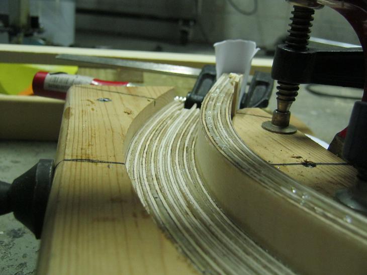Viime viikon loppupuolella liimailin takakulman kasaan. Vanerista laminoitu kaariosa ja siitä alaspäin molemmat rimat liimattuna paikoilleen,
