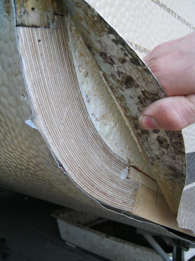 muuta. Vanerit oli kaikki kuivia mutta joskus käyneet märkänä, liimat kadonneet. Styroksit oli ehkä kolmen kämmenen kokoiselta alueelta vielä kosteana.