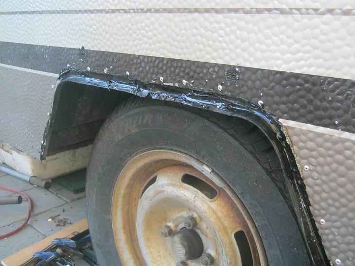 Laitoin reilusti liimaa ja muovinen lokari vielä pop-niiteillä seinäpeltiin kiinni. Ei mene enää vesi väärään paikkaan.