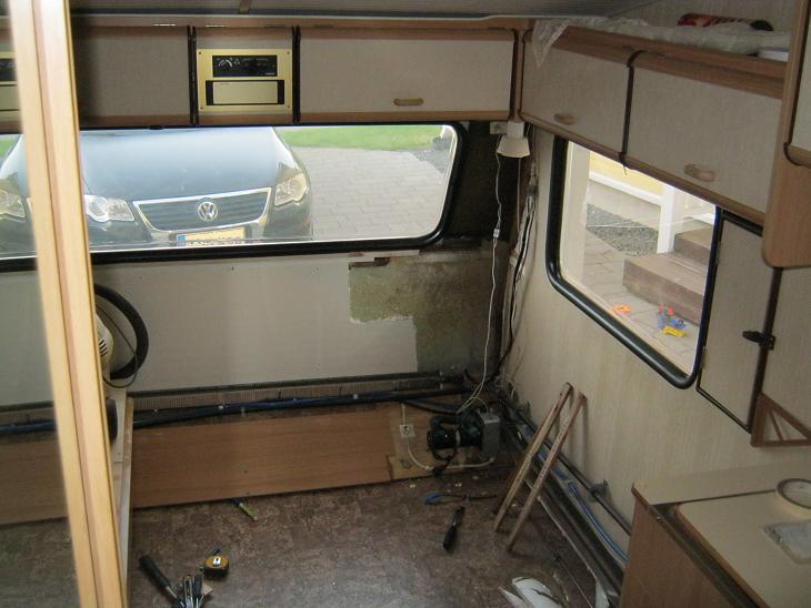 Ja seinä nurkasta rutisi kivasti. No puolessa tunnissa vaunun etuosa purettu kalusteista ja mattopuukkoa kulmaan. Kosteuttahan siellä oli, mitäs