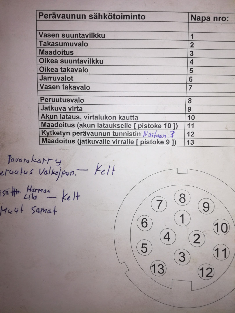 ![]() Mittailin opelista jännitettä pistorasiasta nastoista 9 ja10---11 ja13 ja akulta, en huomannut mitään eroa. Ajattelin mitata 120 W. kuorman kanssa, mutta mämmikourana tein valokaaren ja opeli hörähti, jännitehäviö 100 % --sulakkeet paloi. Pitää joskus tulevaisuudessa pistää uudet, ovat hanskakalokeron takana hankalassa paikassa lähellä laturia. Aiemmin oon maininnut pojan Saksan tuonti Volvosta, jossa oli jännitehäviöö ilman kuormaakin. Lienee virta tullut ohuita piuhoja pitkin monen liittimen kautta? En muista oliko siinä jatkuva virta, kun on muutama vuosi siitä kun mittasin? Luulakseni noita pistorasia asentajia on moneen "junaan", osa varmaankin masentajia. Tuo 12 meillä on kytketty tavalliselle (87/87a) releelle joka vaihtaa pakkivalon ja ehkä peräkameran veturista vaunuun/peräkärryyn. Varokaa pistämästä sitä jatkuvaa virtaa, jos pidempään ootte samassa paikassa. Akun lataus sananmukaisesti virtalukonkautta lienee aika "laihaa"? Eihän tuolla ajonaikaisella latauksella kunnon karavaanari mitään tee, vain meillä puskatalebandeillä on sille käyttöä-ehkä on suorastaan välttämätön. ![]() Minun Kabessa nastat 9 ja 10 ovat jo tehtaassa kytketty yhteen. Jännite lataukseen ja jääkaappiin menevät releen kautta. Rele aktivoituu kun vaunun äärivalot kytkeytyvät päälle.