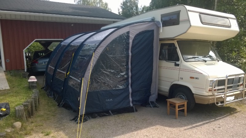 ![]() Tuossa Bilteman teltta autoon kinnittettynä. Sattumalta bongasin reissulla samanlaisen Dethleffsin, jossa oli Bilteman isompi teltta. Kurvasin sitten seuraavaan Biltemaan ja ostin itselle kans. Hyvin se istuu tuohon autoonkin. Telttauralista auton kylkeen, markiisin alle ja siihen teltta kiinni. Hinta/laatu on mielestäni ihan hyvä. Eikä pystyttäminenkään ole paha rasti. Pystyputket jotka painavat telttaa vaunun seinään, saisivat olla kyllä tukevammat ja jokin piikki pohjassa että pysyisi paikallaan.. Pitää viritellä vissiin paremmat putket niin ei karkaa seinästä..