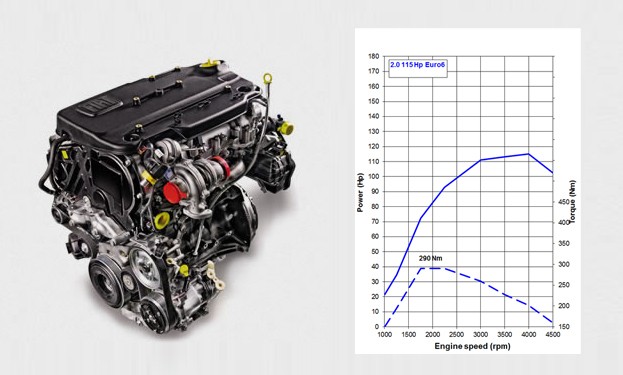 The 2.3 MultiJet engine is in the middle of the Ducato range. It delivers a maximum power of 130 HP (96 kW) at 3600 rpm and maximum torque of 32.6 kgm (320 Nm) at 1800 rpm.