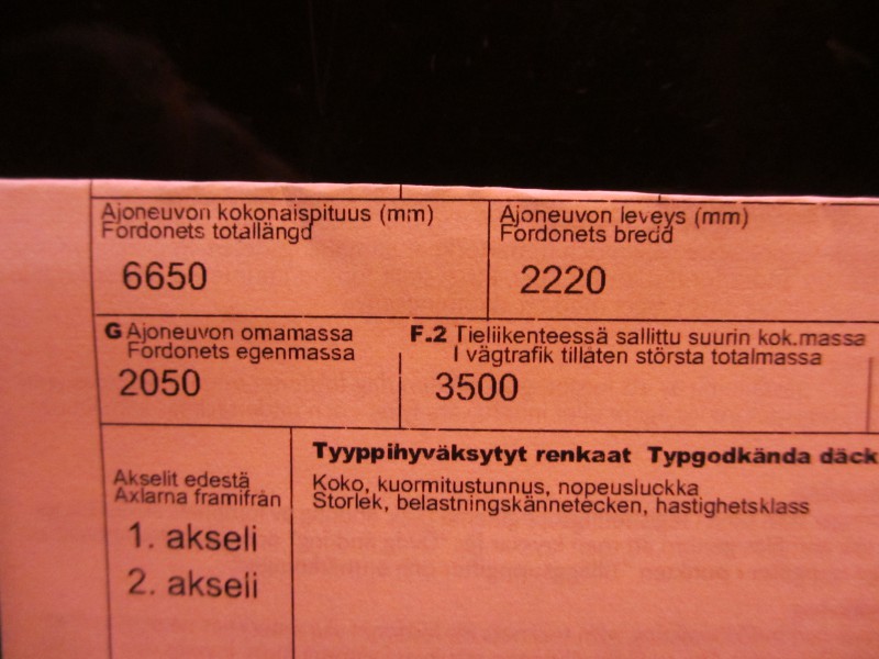 Katsastin asauton ja laskin samalla aseman näyttämät painot. Katsastusmies, minä, 2 kaasupulloa, polttoainetankki täynnä ja vesitankki vajaa painoa oli 3310kg. Otteessa omamassa 3100.