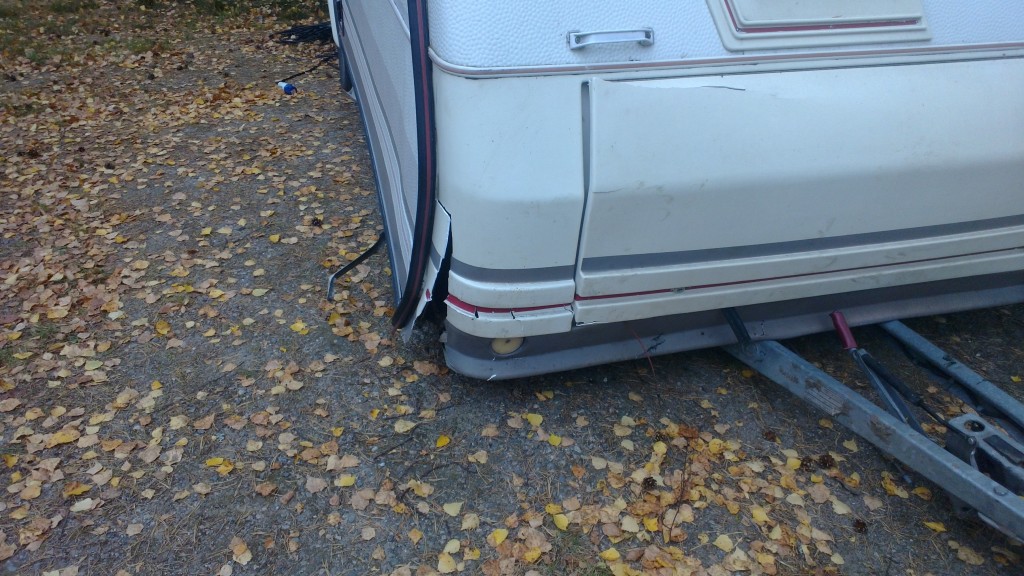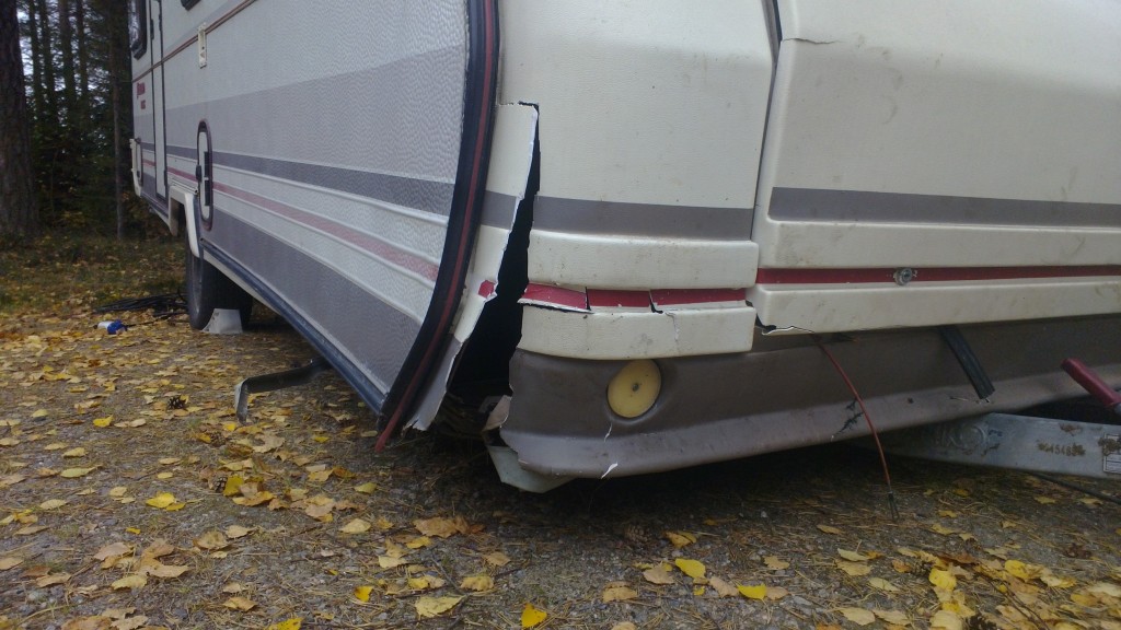 Tuossa taitaa olla molemmat aisat mutkalla ja koko vetopää siirtynyt vasemmalle? Minä kyllä vaihtaisin koko aisan ja korin osalta alkaisin kysellä purkaamoilta "uutta" kaasupullokoteloa. Kylkipelti vaikuttaa ehjältä, joten kulma vaan auki, rimoitus ja eristys kuntoon ja butyylin kera kulma tiiviiksi. Sitten se ehjä kaasupullokotelo paikoilleen...