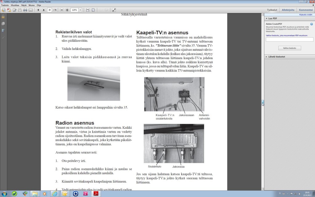 Ok. Siis onko noi ns. viikset tarkoitettu tuon VHF -alueen vastaanottoon? Kyllähän tuo rakenne ainakin ulospäin poikeaa talojen antenneista. Luulin että ne jotenkin liittyvät radiovastaanottoon  Oletin hyväuskoisena, että vaunun tuotantovuonna on digitv lähetyksiä on ollut jo pitkään euroopassa Katsoin vaunusta, että tosiaan siinä boxissa luki kyllä power supply - eli syöttänee tuohon antenniin myös sähköä. Kysymys kuuluu; voiko tuon antennille menvään liittimeen kytkeä tuon satelliitti/keskusantenni tulon hajottamatta mitään?  Tuo valkoinen mötikkä näyttää toimivan myös antennijohdon haaroittimena?  Tuskin kyselisin jos tuosta antennista olisi löytynyt jostain jonkinmoista manuaalia/ohjetta tai muuta vastaavaa... Ja arvatenkin vaunun käyttöohjekirjasta ei mitään apa ollut