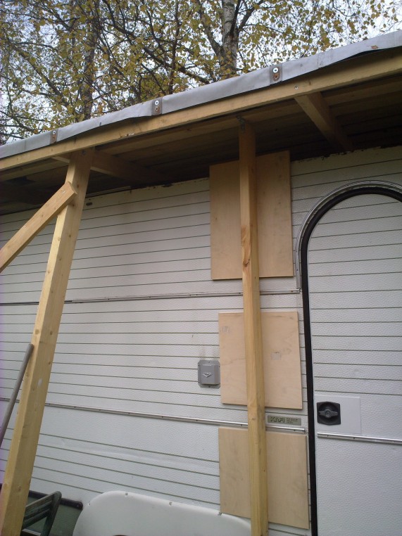 Tekasin tällaisen siirrettävän ulkotuen jonka saan ankkuroitua maahan ja ruuvattua katoksen runkoon siksi aikaan kun eristeet ovat liimauksessa: