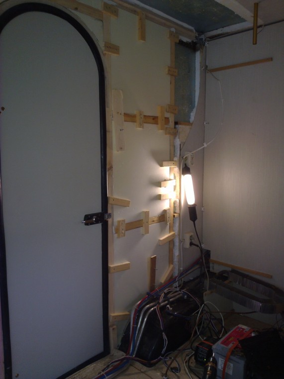 Tarkoituksin on myös jäykistää seinää pystypuilla jotka sijoitetaan väliseinien kiinnityskohtien paikkeille. Näin saadaan tukeva väliseinien kiinnitys. Nythän ne ovat vain kiinnitetty pintavaneriin sekä yritetty osua seinissä kulkeviin vaakajuoksuihin, tosin huonolla menestyksellä. Pitää ottaa samalla huomioon kun seiniä jäykistelee ja runkoa sepittää ettei pääse Kafi lihoamaan liikaa, mutta uskon jotta pysymme ihan oikeissa painoissa koska laihdustakin tulee olemaan. Tarkoituksena on purkaa takana ole yläsänky pois, näin saamme hippasen lisää tilaa takapäähän.