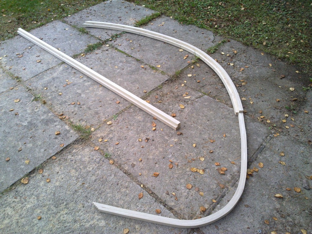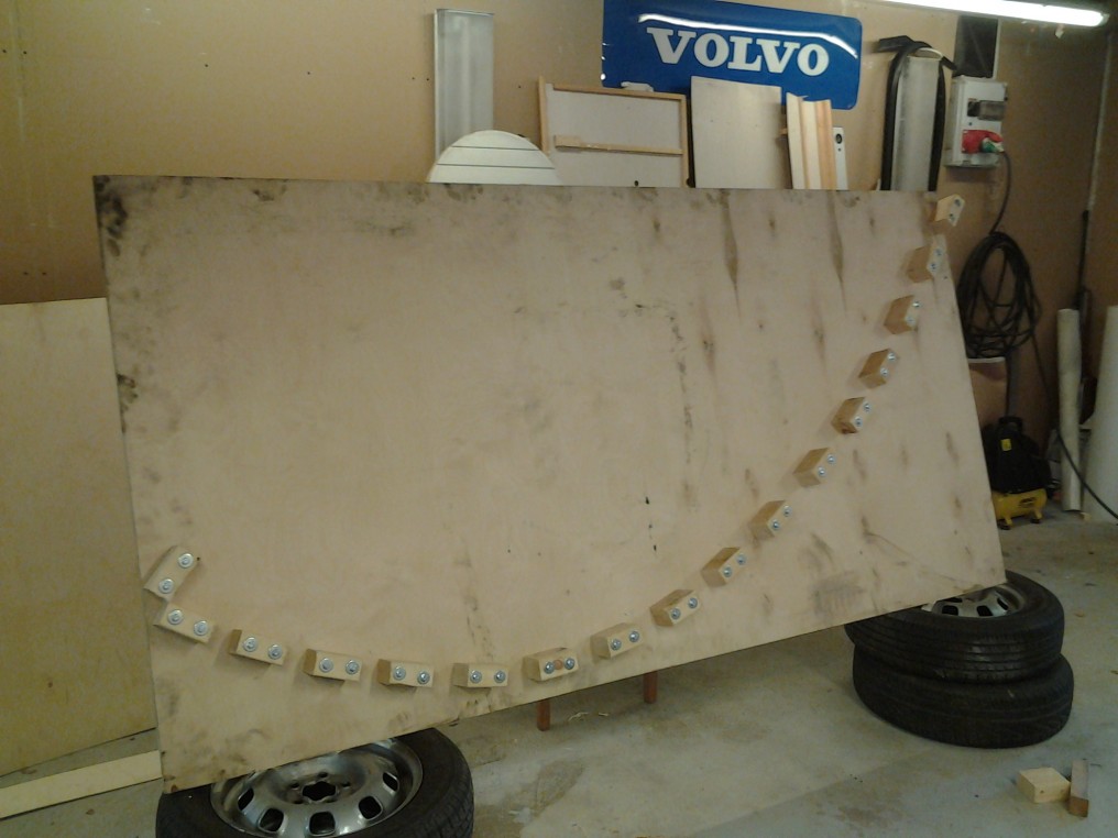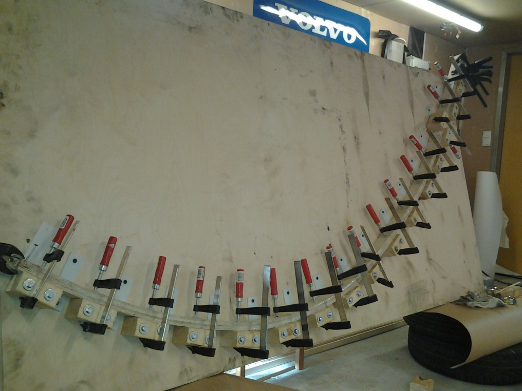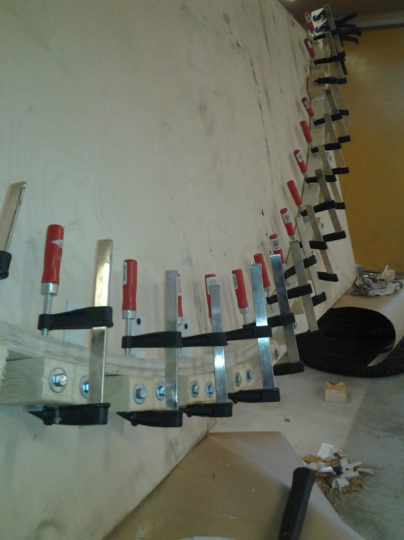 Ja siinäpä rupesi vaneri-suikaleet saamaan muotoa liiman ja puristimien avulla. Lisäksi laitoin jokusen rosteriruuvin kaareen säännölisin välein: