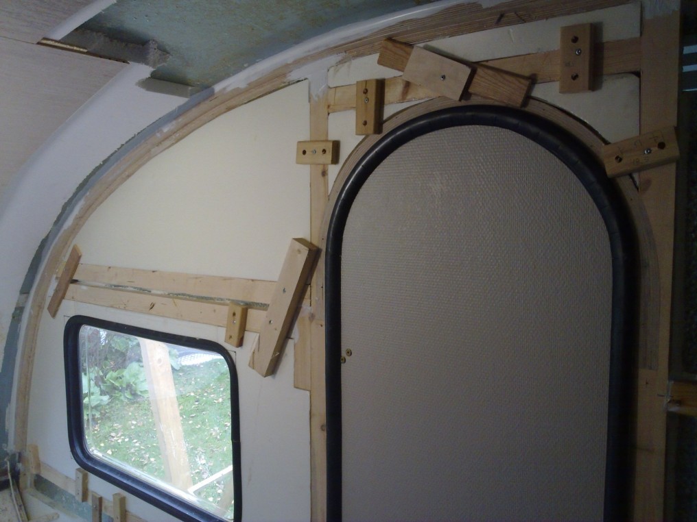 Laitetaan vielä kuva asennetusta kaaripuusta. Samasta kuvasta näkyypi nipin napin(hämärä) mitenkä oviaukon kaaren toteutin, sekä korjattu ovi joka on jo paikoillaan. Osa paininkapuloista on vielä irroittamatta jotka painavat Foamia peltiä vasten liimauksen aikana, rakoset täytetään lopuksi uretaanivaahdolla.