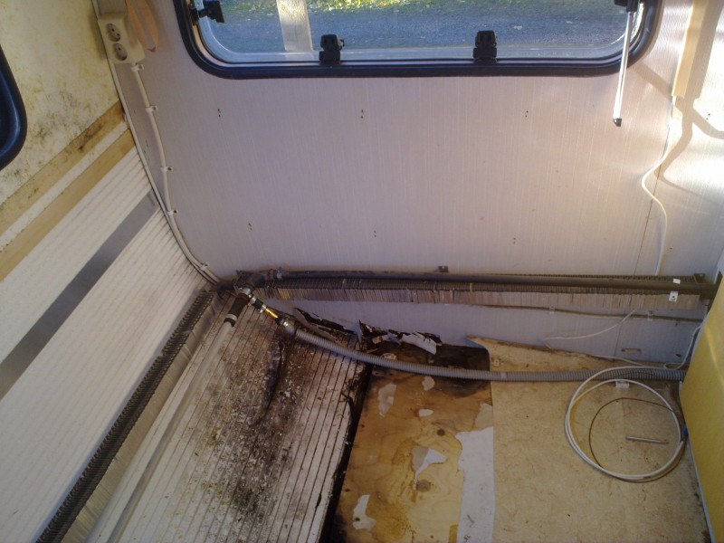 Aika simppeliltä ja hyväältä ratkaisulta vaikuttaa. Hana päähän, josta voi tarvittaessa tyhjentää. Mitäköhän katsastumies aiheesta ajattelisi, jos tommoisen väsäisi vaunun lattian alapuolelle (ulkopuolelle)? Saako runkorakenteeseen kiinnittää mitään vai pitääkö pultata lattiaan?