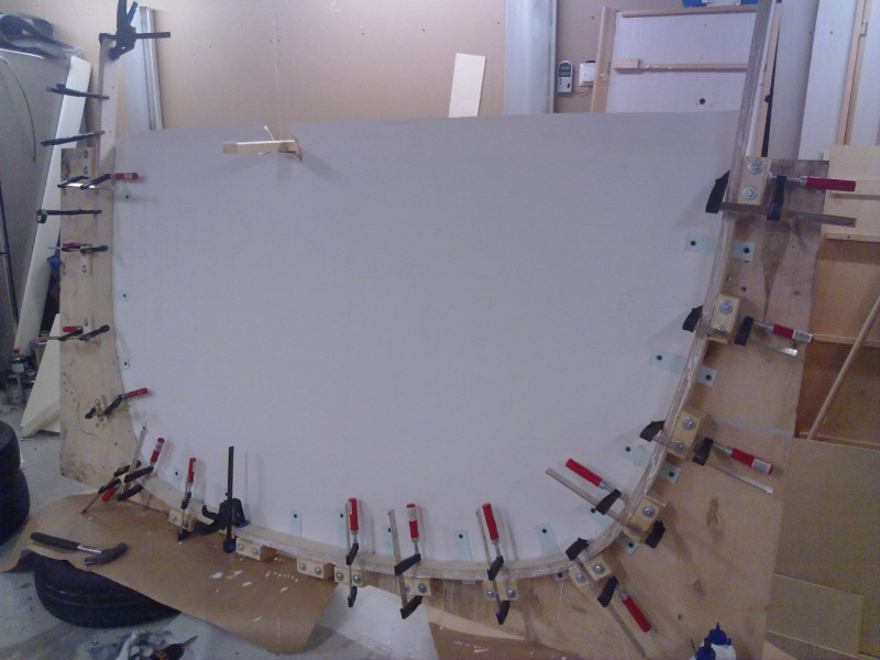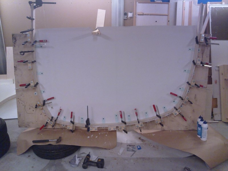 Laittelin iltasella ensinmäisen osan takapään-kaarta liimaukseen, huomenna lisätään muutama suikale vaneria lisää ja lisäksi laitetaan jokunen ruuvi sekaan.