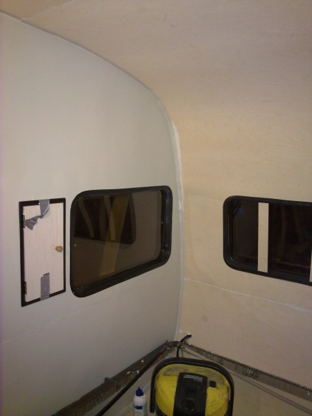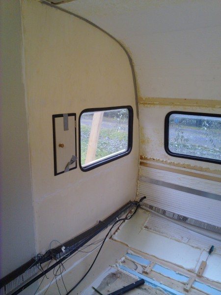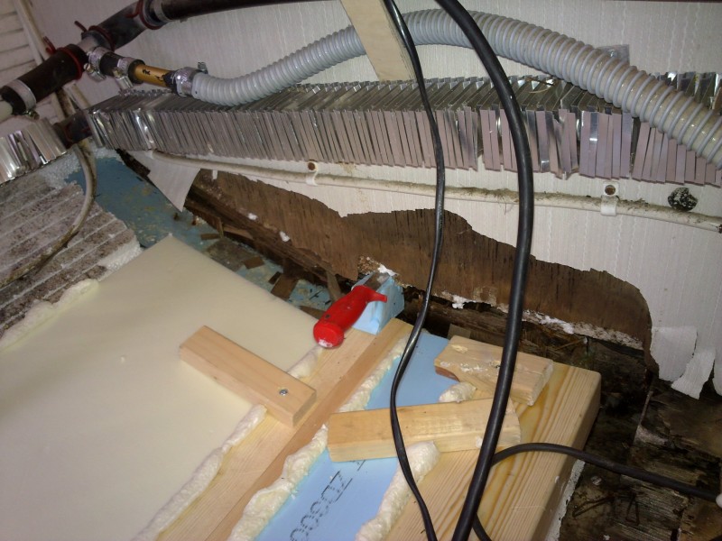 Tänään on taiteiltu(on aukkoja ja kaarevaa muotoa) sisäpintalevyä takapään seinään ja lattiaakin on korjaus paloja sahailtu. Hitaasti, mutta varmoinottein  Thumb.