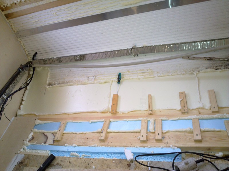 Itse kanssa etsiskelin tietoa netistä ja mitään oikeanlaista  ohjetta en löytönyt, eli ohjeita oli yhtämontaa kuin käyttäjääkin. Pääpiirteittäin homma meni minulta näin. Pinnat puhtaaksi irtotavarasta tässä tapauksessa styroksin jämistä ja osa vanhoista liimoista jotka lähtivät suosiolla. Leikattiin n.10mm kauttaaltaan pienempi Foaminpala aukkoon. Vaahtoa levitin noin pikkusormen vahvuista nauhaa levyyn laidasta laitaan noin n.10cm väliäpitäen. Uretaanin levityksen jälkeen odottelin n.2min, että vaahto laajenee ja tämän jälkeen painoin levyn paikoillen, samalla hierasin sitä pintapeltiä vasten tämän pitäisi lopetta vaahdon turpoamisen. Tukipalikat runkoon painamaan levyä peltiä vasten tämän jälkeen ulos vaunusta ja hieromaa/painamaan pintapeltiä vasten eristettä, ihan vain kädellä pariin kertaan liimattava ala lävitse. Sitten sisälle vaunuun ja tuhaukset vaahtoa liimattavan levyn nurkkiin, siis eristeen ja rungon väliin. Jos on isokin palanen niin muutamat täpit pitkille juoksuille myös vaahtoa, näin sidotaan levy runkoon ennen lopullista liimausta. Jotkut tukee pintapeltiä ulkoa päin ja näin itse tein kun käytin tuota Kestopurulia, nyt en laittanut kun vaahdolla liimasin ja eikä tuo seinä pullistellut. Mutta vaarana on jos laittaa vaahtoa reilusti niin seinä pullistelee.. Mutta nyt mentiin näin, en tiedä olisiko jotain voinut tehdä toisin mutta näin homma meni siististi ja levyt kyllä tarttuivat seiniin sen kuulee kun käy sormella koputtamassa pinta peltiin vaunun ulkopuolelta  ;)