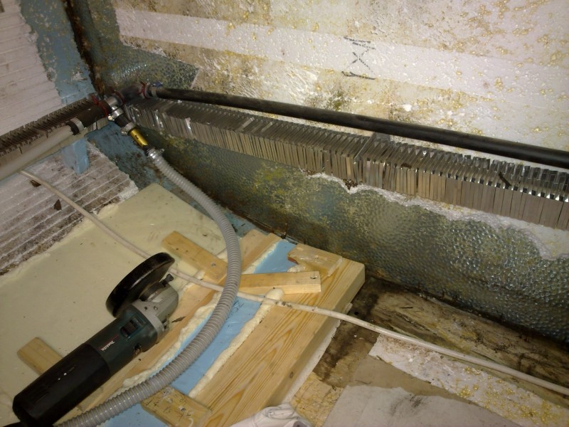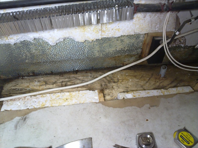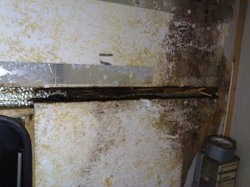Lisää purkuvaiheen kuvia  ;D. Vasemman puolen takanurkka, kaikki laho runkoaines poistettu. Enään vanhojen liimojen ja hakasten sekä ruuvin jämien poisto niin saa asentaa uutta runkopuuta tännekkin.