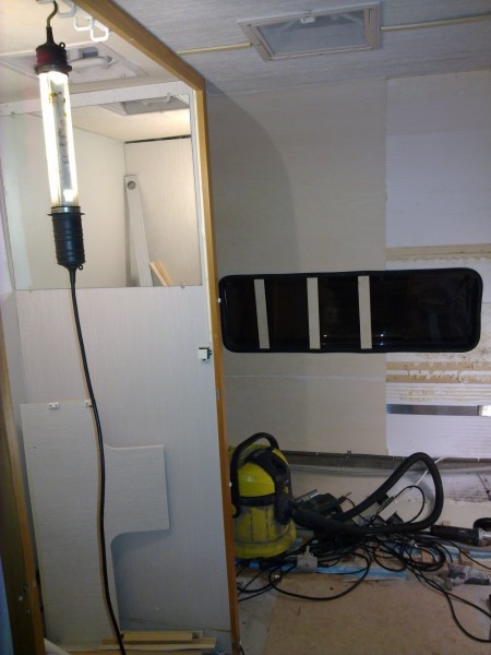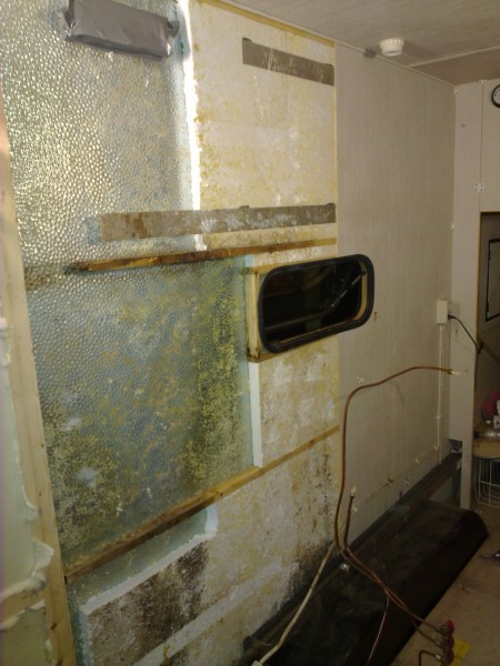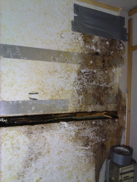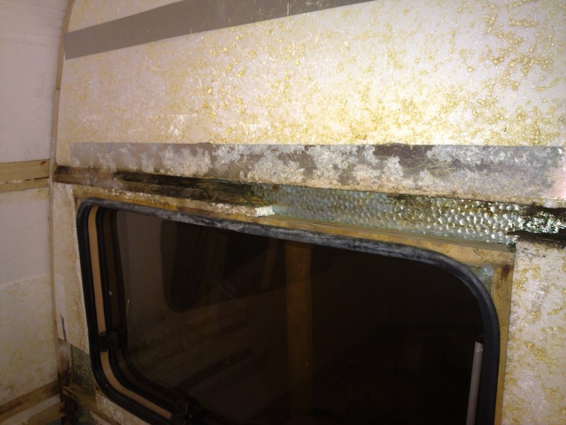 Ikkunan yläpuolella oleva poikkirima on imenyt kosteutta ihan reilummasti. Osa on jo poistettukkin. Ihme on, että yläsänky pysynyt ylhäällä. Ja näkeepä selvästi mistä on myös kosteutta tullut sisälle. Teipin alla, joka näkyy kolmannen kuvan yläreunassa on ilmanvaihtoaukko ja ilman joissakin malleissa näkemääni vaunun ulkopuolista suojakantta. Eli vettä sisään syöttäen, sisäilmankosteus pysyy tällä sovellutuksella hyvänä ja hyvin kosteana  :laugh:. Kyseisen aukon kehys tullaan rakentamaan uusiksi ja ennenkaikkea tiiviiksi. Ilman ohjaus vaunun sisälle tullaan korjmaan paremmaksi ja erillälailla, siitä myöhemmin lisää.