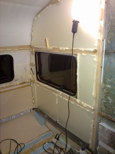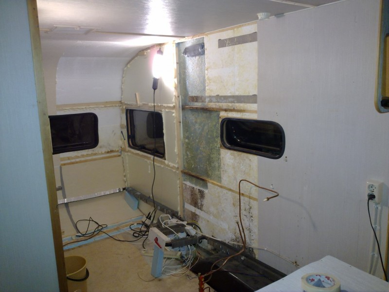 Tuosta keittiön ikkunan kohdalta alkaisi olemaan eristeet kuivia, mutta taidetaan laittaa koko seinä kumminkin uusiksi. Ei viitsisi ihan heti ruveta purkuhommiin, joten samoilla tulilla loppuun asti ompahan sitten uudet eristeet. Ihan näin välitietona, että yksi vajaa levy foamia on jäljellä niin paketillinen on silputtu ja asennettu. Elikkäs 15 neliötä on mennyt. Puolikas paketti vielä niin luulen, että pääsee loppuun asti. Hukkapaloja ei ole pahemmin jäänyt, tarkoin olen pyrkinyt käyttämään kaiken mitä on ollut. Onhan tuossa ollu tuota hommaa ihan kiitettävästi, ei heti käynyt mielessä jotta joutuu pistään vaunun näinkin päreiksi mitä on jouduttu tekemään. Jospa näistä jutuista ja kuvista on ollut jollekkin jotain hyötyä ja antanut kipinän alkaa fiksaamaan omaan Kafiaan, ei muutakuin hommiin vaan. Tänään näin Isänpäivänä ei kerinnyt hirveitä tekemään, muutaman runkopuun ruuvasin ja liimasin paikoilleen. Taisipas mennä ihan suunnittelu hommiksi  ;) Ja kiitokset palautteista  Thumb.