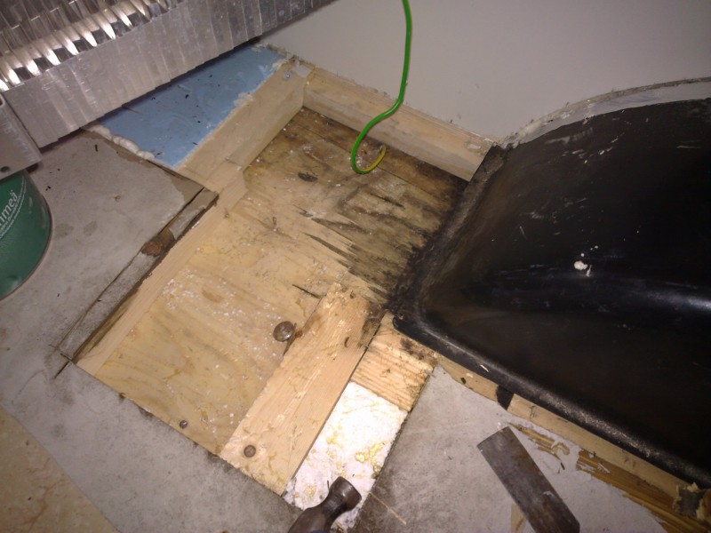 Ja päästiinpä lattian laittoon. Ensin kaiveltiin lahot mutta nyt jo kuivat puun muhat pois lattiasta. Kuva on vasemmanpuolen pyöräkotelon takapuolelta: