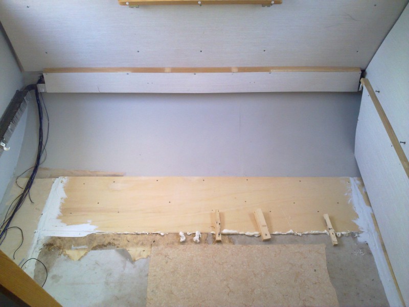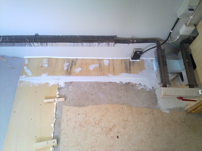 Tämän päivän saldoa. Takapään lattia levytettynä ja osaksi saumat liimattunakin. Seinän vieressä olevassa vanerissa lievää pigmentti härnää, valmiiksi tummunutta  :D.