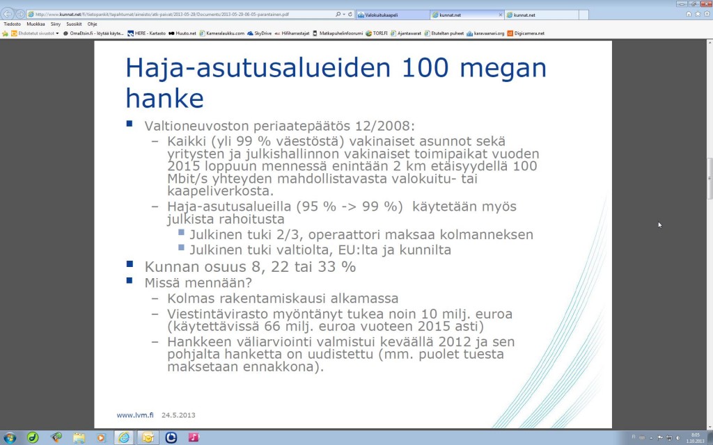 Näkis vaan , rahat kuulemma loppu ,ei pysty tuosta tien ojasta kolmeakymmentä metriä liittämään meidän torppaan . Ensvuojelle menee . Täällä ollaan sellaisessa mokkula katveessa notta toimivat kun huvittaa ja välillä puolen tunnin jumia . Näin aamusta pellaa jotensakkin . DNA:lta ei ole kysytty. Tokkopa siltäkään saa, kun ei Sonera eikä Elisakaan pysty kuitua toimittamaan.No ei kai DNA ala vetämään kuitua johonkin vähänkään sivulla oleville. Tuo iso kuitukäyttäjämäärä jää haaveeksi jos talous sieltä toinen täältä ottaa liittymän ja kilometrikaupalla (lue 10 kilometrin yksikkö) joutuu ojaa tekemään. Ja narua päätelaitteineen asentamaan. Tuohon ei saa edes EU-tukia millä nuo kauempana olevat kohteet tekee tuon homman. Koska EI ole haja-asutusalue http://www.kunnat.net/fi/tietopankit/tapahtumat/aineisto/atk-paivat/2013-05-29/Documents/2013-05-29-06-05-parantainen.pdf Kaupungissa DNA on saanut kuitua vedettyä kun on lahjottu isännöitsijä otattamaan koko talon asukkaille tuo liittymä. Laki antaa tähän mahdollisuuden, eli vaikka asukkaalla olisi 2v sopimus jollekin toiselle operaattorille tai hän ei haluaisi datayhteyttä lainkaan, joutuu silti ottamaan tai ainakin maksamaan vuokran/yhtiövastikkeen päälle tuon maasutetun isännöitsijän junaileman summan , joka yhtiökokouksen päätöksellä tulee jokaiselle asukkaalle / vuokralaiselle Esim minä maksan yhteydestä kuukausimaksun mitä minulla ei ole, eikä tule. ![]() Aika outo yksilönvapautta rajoittava juttu. ![]() No ei kai DNA ala vetämään kuitua johonkin vähänkään sivulla oleville. Niin, ollaan tosi syrjässä. Linnuntietä tämän pikkukaupungin (asukkaita neljännesmiljoona) kaupungintalolle on noin 900 metriä... (Googlen mukaan kävellen ovelta ovelle 1,1km) Vähän sama kun hesassa ei saisi Etu-Töölöön tai Hakaniemeen kuitua. Kamppikin olisi liian syrjässä... Kaupungissa DNA on saanut kuitua vedettyä kun on lahjottu isännöitsijä otattamaan koko talon asukkaille tuo liittymä. Kyseessä on kiinteistöinfra, ei liittymän pakkomyynti. Vähän sama kun valittaisit keskusantennista, kun telkkusi näkyy henkarillakin ja näin ollen "joudut" maksamaan turhasta. Mutta kun siihen ei saa sitä edellisen liitteen mukaista tukea. Niin silloin ei operaattori voi vetää sitä kaapelia tietämättä käyttäjämäärää. Isoissa asutuskeskuksissa menee kaapeli (kupari / antenni) joka kiinteistöön ja tämä täyttää tuon laajakaistamääreen , koska maksimi on 24 megaa adsl tekniikalla ,vdsl:llä vielä enemmän.