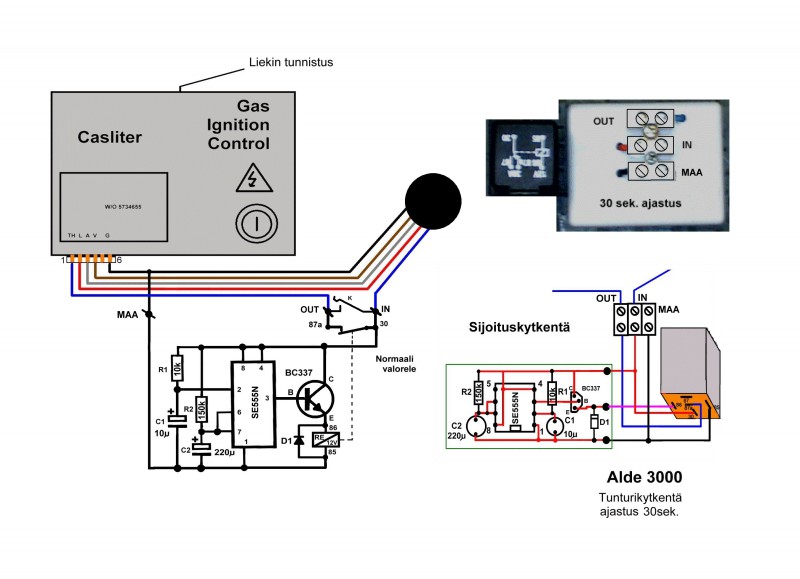 Ymmärsinkö oikein, että alden 3000 käyttöpaneelissako ei ole EXT liitäntää, johon tunturikytkimeltä tulevat piuhat kytkettäisiin? Vaan tunturikytkin tulee laittaa pannulle tulevan +12v johdon väliin, eli tunturikytkin virroittaa pannun, kun käsky käy? ja mikäli pannun ohjainpoksissa on 15s warten teksti, pittää tehdä ajastinkytkentä viivereleineen, jos haluaa pannun syttymään kaasulla?
