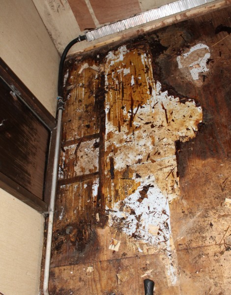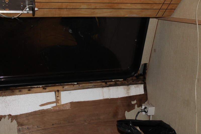 Laitan huomenna parempaa kuvaa. Rakenteet ovat kuivat, levy vaan oli jotenkin saanut märän pinnan??? Epäilemme vuotoa lämmitysputkessa joka kuvassa koska muualla vaunu oli kuiva... siis kuvaa enemmän on nyt purettu..