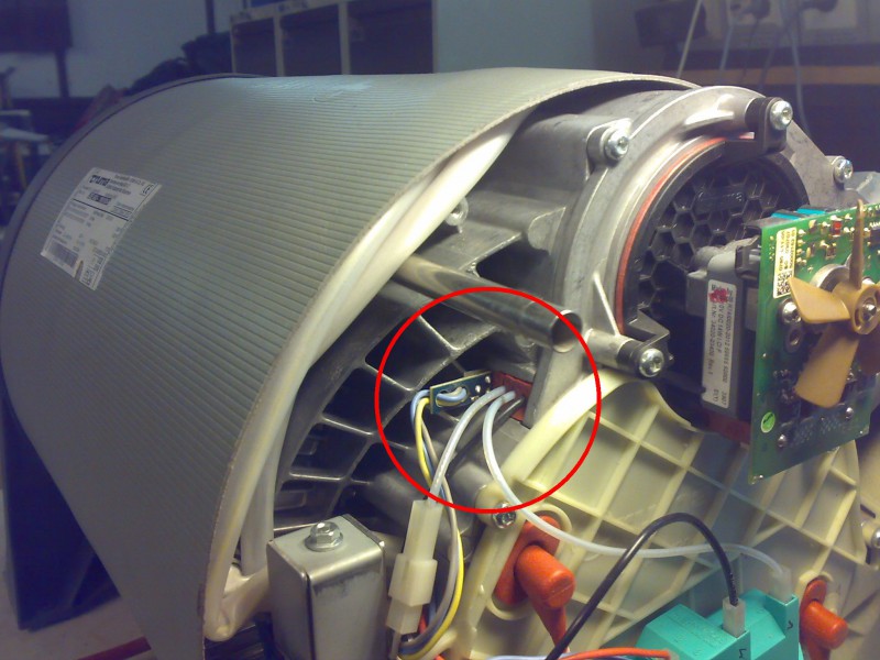 Tossahan toi paloilmapuhallin on aiemmassa kuvassa. Rengastuksen oikealla puolella ja sen johdot löytyy piirilevyn liittimestä.