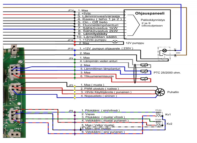 Lohduttavana tietona voin kertoa että se on helppo korjata. Pelkällä piuhan vaihdolla ei selvinnyt, sen verran pahasti kiinni lämpöanturissa. Anturisarja maksoi tunnetussa kotimaisessa monialayrityksessä n. 50€. Sininen ja punainen anturi ovat lämpöpannun antureita ja ne ruuvataan kiini pannun kanteen. Anturit eivät mene vesitilaan sisälle vaan vesitilan pintaan joten voit irroittaa ne ilman että tarvitsee tyhjentää glykoleja. Musta piuha mittaa vesiboilerin pintalämpöä. Anturisarja kytketään liittimellä piirilevylle, piirilevyä pitää irroittaa sen verran että saa ujutettua tämän surullisenkuuluisan piuhan siististi pois ja uuden paikalleen. Minun tapauksessani korjaamisen onnistuminen varmistettiin ajamalla vedenlämmitystoimin toa koko puoli tuntia. Kun vika oli päällä, OHEAT2 tuli aina kun vedenlämmitystä yritti. Anturisarjan vaihto on sen verran nopea ja yksinkertainen että jos kaikkeen muuhun menee hermo niin tätä kannattaa ehkä kokeilla sillä riskillä että se 50€ oli virhesijoitus. Muita vikamahdollisuuksia ovat joku hankalampi elektroniikkavika tai ilmaa pannussa, mutta se ilmajuttu oli kai jo käsitelty loppuun.