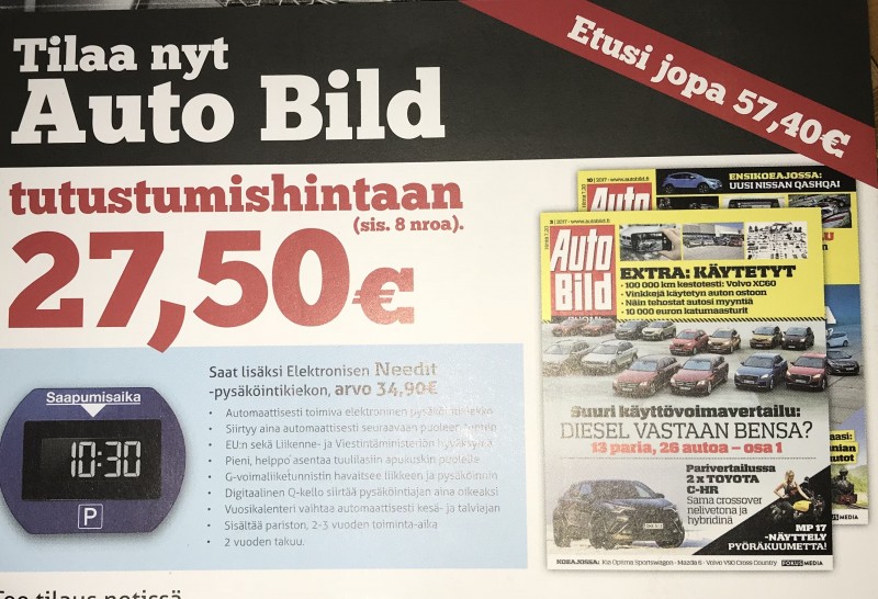 Nyt kannattais tilata AutoBild, ”harmi” kun sekin autolehti jo tulee ja tuollainen elektroninen parkkikiekko on kaikissa autoissa.