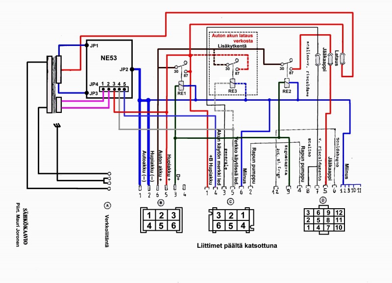 Onhan kyse matkailuautosta? Ota kansi auki laturista, että näkee sisälle niin sitten saattaa selvitä mikä on laturin tyyppi. Laturi tuskin on Elnag vaan Nord-Elektronic tai Ramer. Puhdas arvaus. Saattaa ola jopa tämä kytkentä, kuvan liittimet ei näy kunnolla. Juu sieltä se selviää, ennen kesän lataus sesonkia pitää asia selvittää. Kuva vähän valehtelee ja tuo on niin poskettoman vaikeessa paikassa, muutoinhan tämä olisi jo selvitetty. Tuo on takuulla ruuvattu levynpäälle ennen kaapin seinien asennusta. Sivuja: [1] Siirry ylös