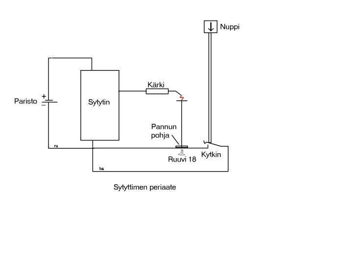 Mötikän takana reunassa kaksinapanen liitin jonne tulee musta ja ruskea, keskellä yksi liitin josta lähtee johto sytyttimelle. Voiko tätä sytytintä testata jotenkin ?. Käsittääkseni jos kaksinapasen liittimen oikosulkee niin pitäs alkaa napsuttaan. Lämmitin toimii muuten, testasin kaasugrillistä lainatulla paineltavalla piezolla.