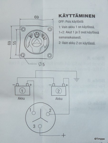 Mulla sellainen (ei saa enään) 3~ pääkytkin jossa kolme vipua hatulla yhdessä, poistin hatun ja nyt pystyn päättämään mitä akkua puretaan ja samalla laturi voi ladata jo tyhjentynyttä silloin agri käy. Samanlaisia ollut takavuosina 1~senakin.