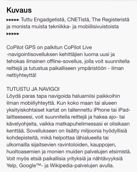 Applen laitteisiin on saatavilla CoPilot GPS jota käytin ilman mitään yhteyttä viime kesänä Norjassa, olihan siinä hirvittävä vaiva, piti ladata AppStorelta, ilmaiseksi. ;D