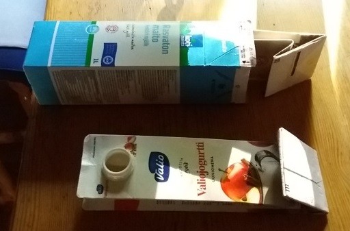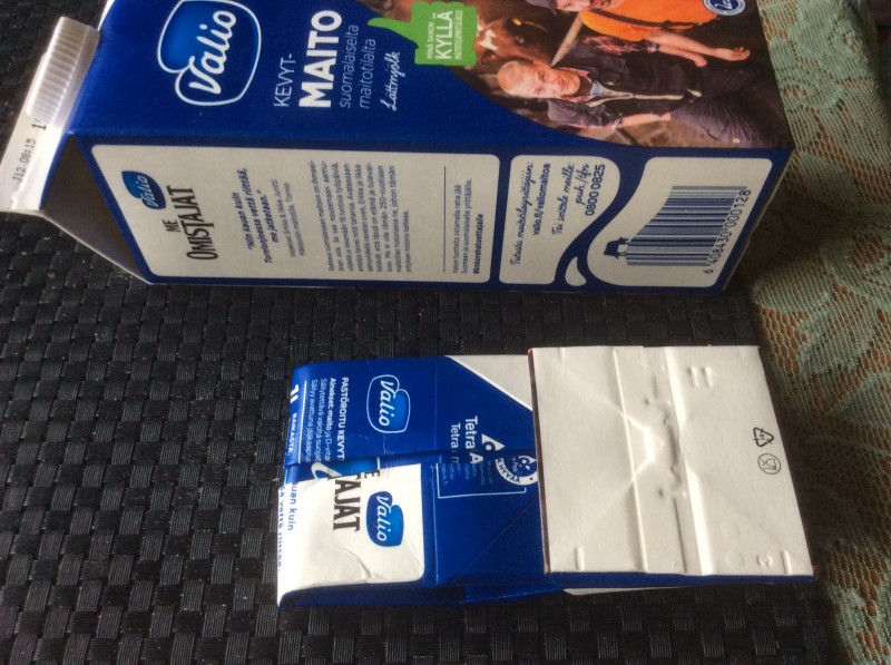 Ei kai kierrättäminen ole vaikeaa? Yhteen litran maitotölkkiin mahtuu 6-7 tölkkiä sisään kierteineen.  Muovit erotellaan kartonkipakkauksist a tehtaalla. Täällä on koekäytössä uusi sekajätteen polttolaitos (sähköä+lämpöä), jonne käy purkissa oleva piimäkin. Toivottavasti kartonkikeräystä ei vähennetä.