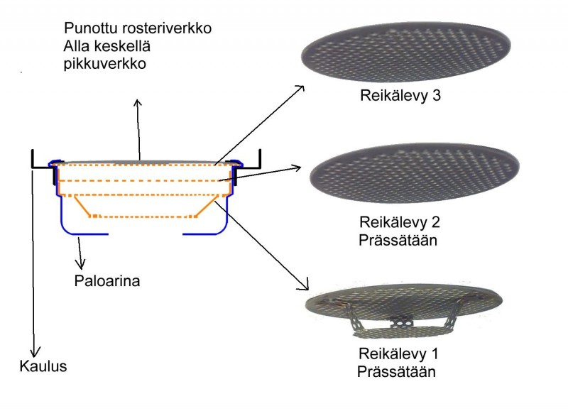 Kaikki reikälevyt vaihtoon. Rosteriverkko on yleensä ehjä, se kangasverkko.