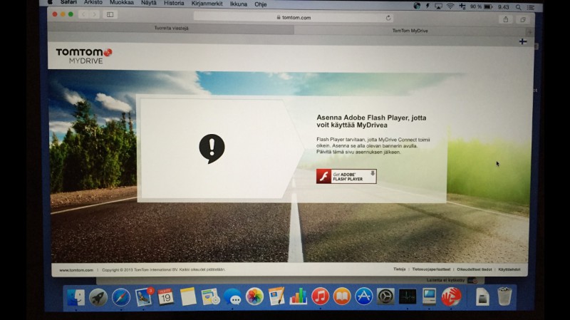 Miten tämän TomTom MyDriven saa toimimaan ilman Flashia tässä MacBookissa, MyDrive asentui ja ilmoittaa että 3 päivitystä on ladattavissa mutta sitten vaatii asennuttamaan Flash Playeria jota ainakin tuolla Hopeisella Omenalla ei suositella asennettavaksi ilman virusturvaohjelmaa.