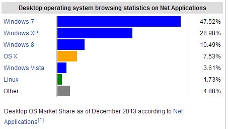 On tietenkin hyvä että ihmiset kertoo auliisti mitä kaikkea niillä on , osa jopa työnantajansa kaikki laitteet.Näin minä ymmärsin ![]() Olenko vanhanaikainen kun lasken tietokoneiksi PC:t: perinteiset pöytäkoneet (desktop) ja kannettavat (laptop) ![]() Sillä kiinnosti nuo "muut" -käyttikset.. Onkohan OS/2 saanut tällä vuosituhannella enää ibareihin? Tukitiketti kloussattiin 2006.. Sitten tosiaan nuo linukkapohjaiset Chrome OS , Firefox OS jne.. oisko ne kuitenki vain Linuxeja.. olishan vielä Unix.. Tällaista tietoa löytyy PC käyttöjärjestelmien jakaumasta; ![]() http://en.wikipedia.org/wiki/Usage_share_of_operating_systems Yllättävän paljon näköjään vielä xp:tä liikkeellä. Vistaa ei juuri yhtään :-)
