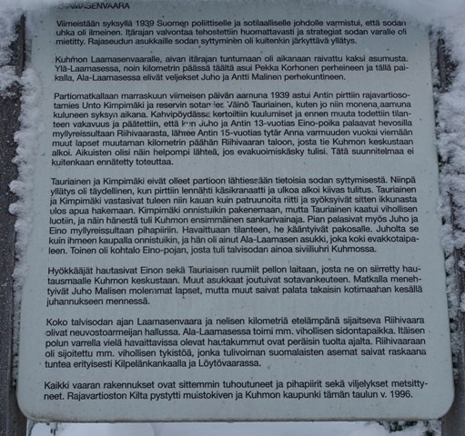 Siellähä on jo suksikelit.. Kiitoksia selkeistä kuvista. Thumb Mielenkiintoinen tarina paikalla. Nuo taistelupaikat on kiinnostavia, kun niissä on sitä historiaa ja mullakin on omassa suvussa kanssa noita kaatuneita ja selvinneitä. Kattelin kuukkelista tuon Laamasenvaaran nimellä niin löyty mielenkiintonen sivusto sen alueen sotahistoriaan.