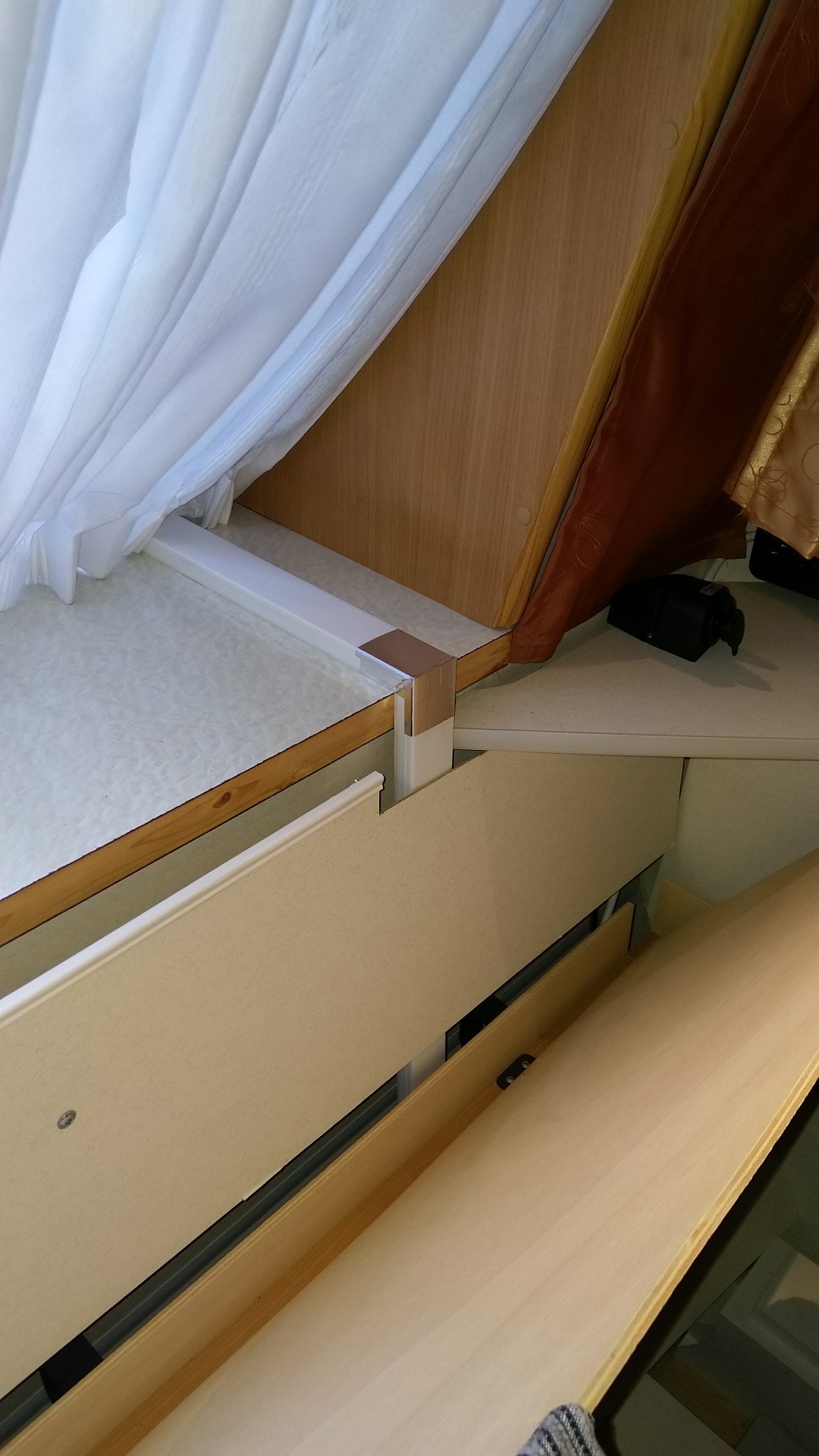 Oireet samat, eli Hobbyn etupää kastuu kaasukotelon yläpuolelta. Otin kaasukotelon kannen saranoineen irti. Näyttäisi siltä, että vesi pääsee saranan ruuvien rei'istä kastamaan kotelon yläpuolella olevaa poikittaista puuta. Etupään isoa peltiä saa sen verran raotettua, että näkee puun olevan vasemmalta puolelta kukkamultaa... Ei pysy saranan ruuvit kiinni siinä.