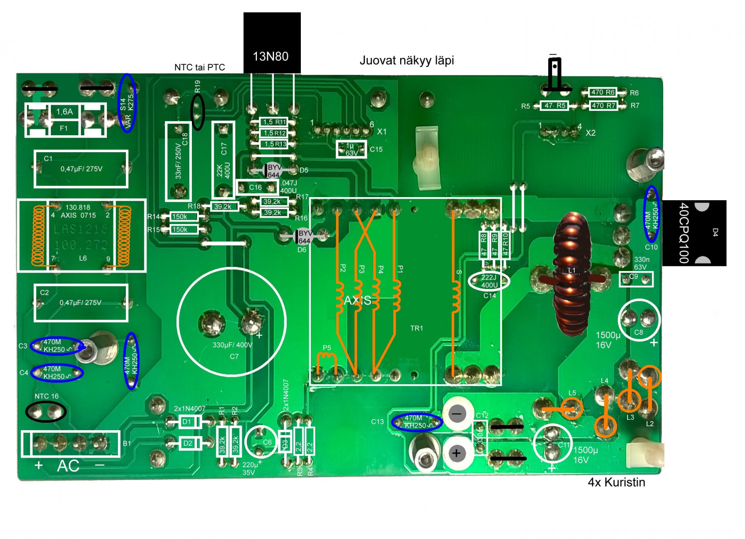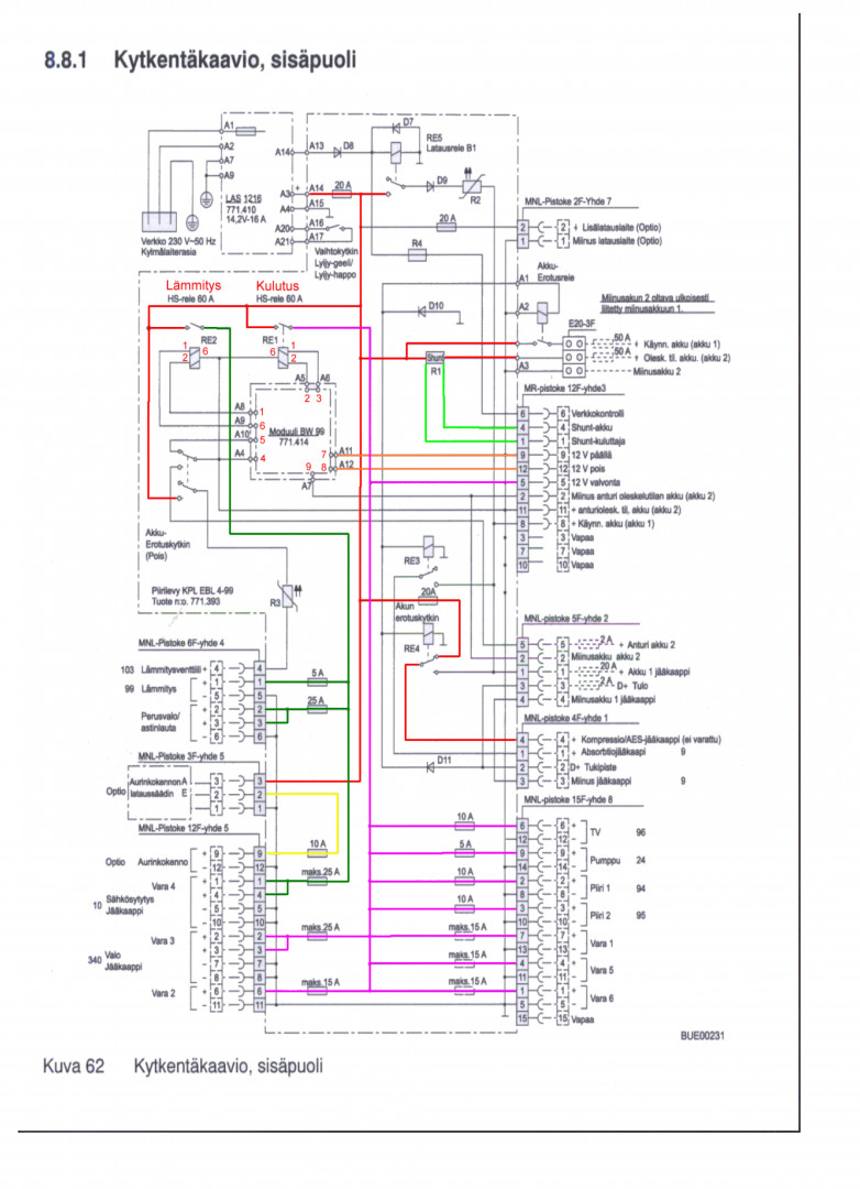 En ymmärrä elektroniikasta juuri mitään, mutta olisko niin ettei 12v lähde Ebl:stä ulos? (230v valo ei pala ohjauspaneelissa, ja akkujen volttimittarir näyttävät 12,5 ja 12,4 - ei eroa jos auto on kytkettynä verkkosähköön tai ei) Vaikuttaa siltä ettei Ebl lataa akkuja. Käyn aamulla katsomassa onko kaikki ennallaan, jätin Trumaticin 15 asteeseen käymään ja kosteudenpoistolait teen surisemaan yöksi. Katselin kuvaa piirilevystä sekä kytkentäkaavaa, mutta en niistä ymmärrä paljon mitään. Yleismittarinikin on sellainen yksikertainen yli 30 vuotta vanha... Kirjoittanut: mjo33400« : 21.10.2019 kello on 20:48 »Sulake on laitteen sisällä ja jos se on palanut niin en suosittele sen vaihtamista ennenkuin on tarkistettu, ettei mikään komponentti ole rikki. Voi muuten tulla iso vahinko. Verkon merkkivalo toimii vain jos verkkohakkuri toimii.