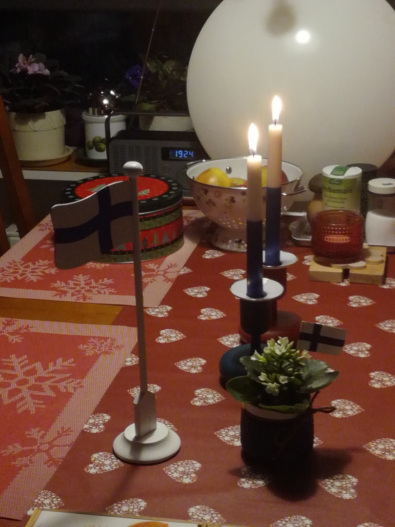 Kirjoittanut: Yrjö« : 6.12.2022 kello on 21:16 »![]() lipun nostaisin, jos olisi tanko.Meillä on tällänen köyhänmiehen tanko. Ei se oikeaa vastaa, mutta parempi kun ei mitään. ![]() Kirjoittanut: Arska« : 6.12.2022 kello on 20:20 »Hyvää itsenäisyyspäivää kaikille. Katselin telkusta katselmuksen ja paraatin, jospa pojan näkisin, ja näinkin, oli kertausharjoituksis sa marssimassa maakuntajoukoissa paraatissa. Sai ylennyksennkin vääpeliksi. Kaiken kukkuraksi iltapäivälehdessäki n oli kuva sällistä paraatissa. Kaksi sinivalkoista kynttilää on ikkunalla, radiosta kuuntelen vastaanottoa ja väkerrän korviksia.