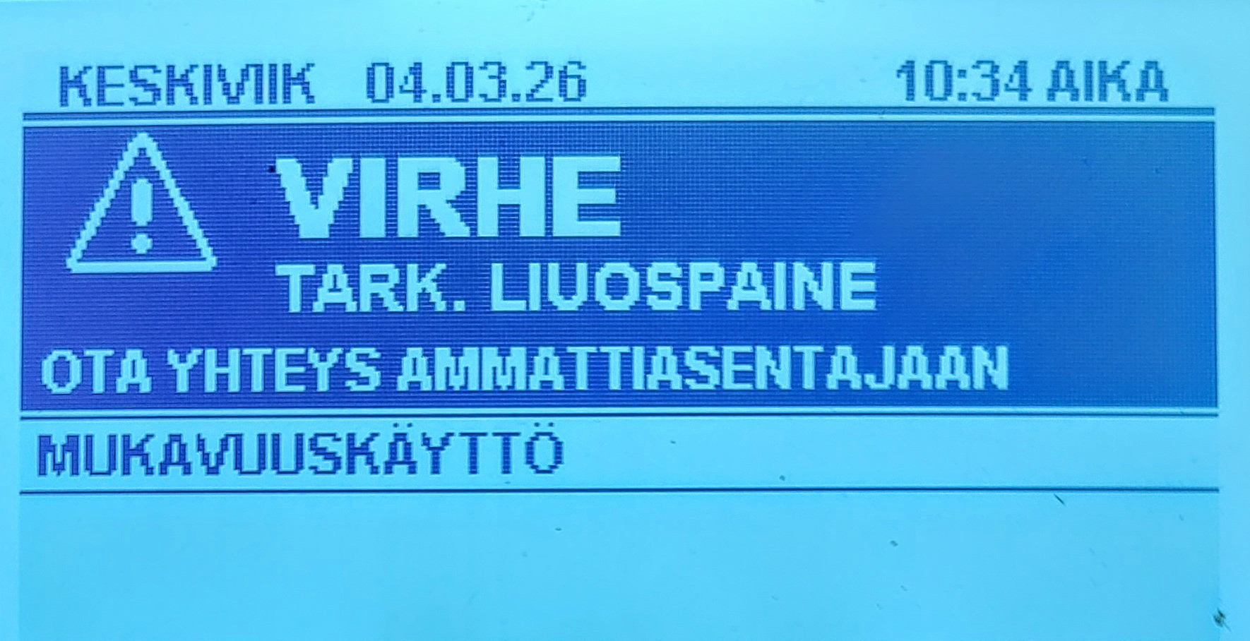 Liikennekäyttöön otto, pesu, OBD todistus huollosta ja katsastus. Kirjoittanut: megaman« : tänään kello 13:15 »Eilen kävi sähkömies ja tänään putkimies, oli tiiviste mennyt maalämpöpumpusta viime viikolla.