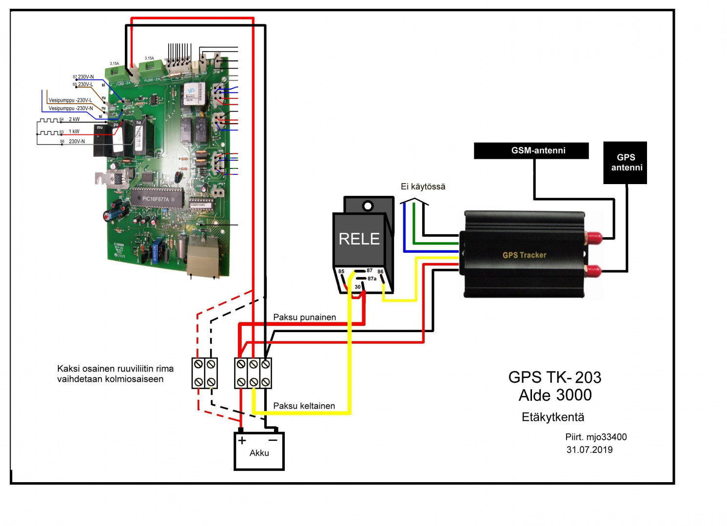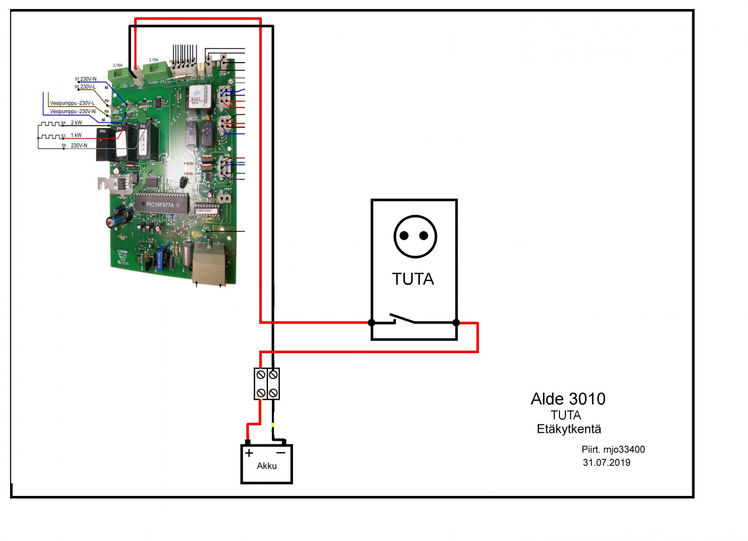 Mutta ratkaisin tunturikytkennän siten, että jatkuvasti virrat päällä vaunussa ja gsm pistorasialla ohjaus alden ext. Eli nyt vain ongelma jos käy sähkökatko (230v puolella).